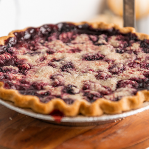 Oregon Berry Pie, Ingredients Marionberries/Raspberry/Blueberry, organic sugar, GF flour blend (brown rice, potato starch, tapioca, xanthan gum), cinnamon, sea salt.